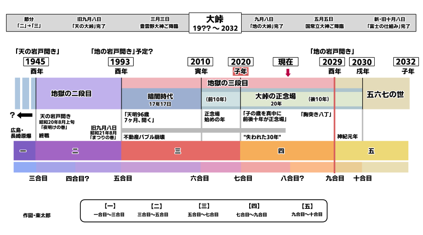 上図を再度見直して頂きたいのですが、私見では「2029年酉年」に「地の岩戸開き」が起こった後、「正念場の20年」の残り一年を消化して「十合目」に入り、世は「三四五(みよいづ)」となり、晴れて「五六七(ミロク)」の世となると説明しています。