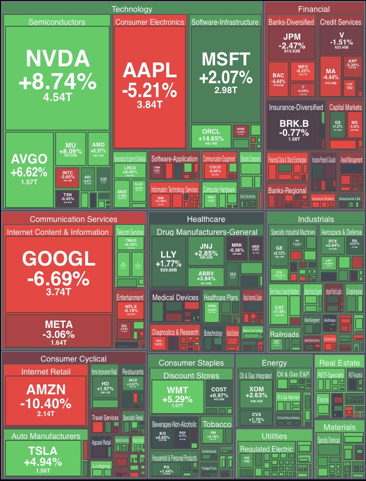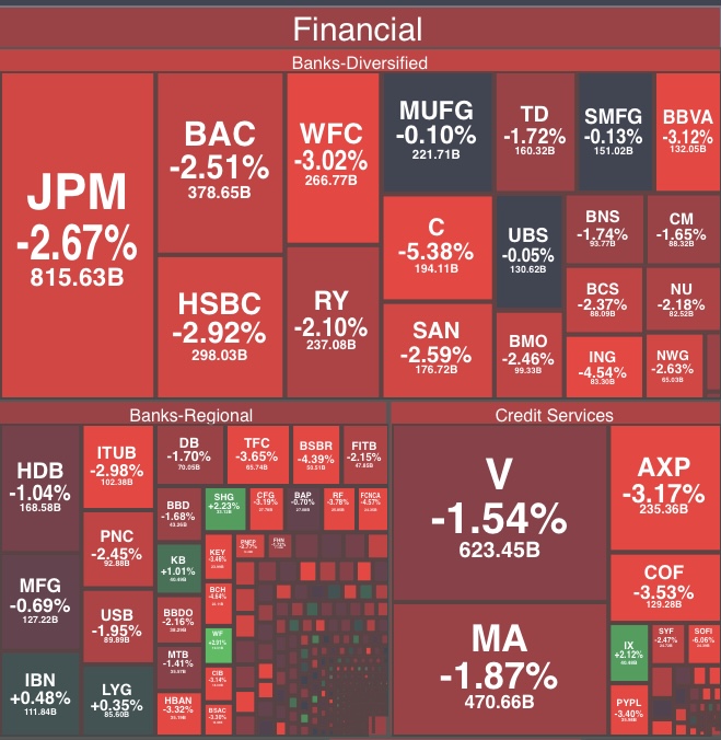 この「赤」はやはり「ハイパースケーラー」ことハイテク大手の衝撃度が目立ちますが、それはともかく「金融セクター」の暖色度も際立っています。