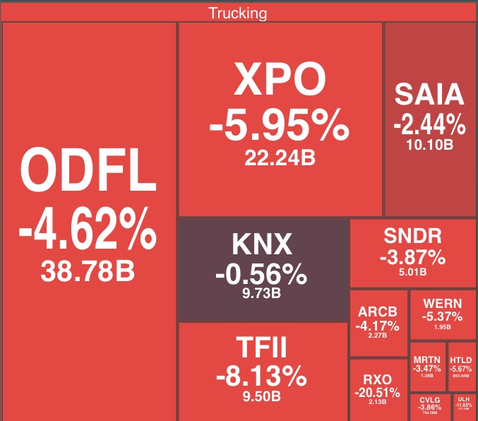 この中で冒頭の記事にある「運送・物流(Trucking)のセクターは、確かに「赤」一色となっています。