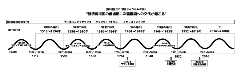 この「景気84年サイクル」の後半に起こる21年間の経済低迷期が、次の覇権国への継承に関与する、というのが増田氏の提唱なされる文明観です。
