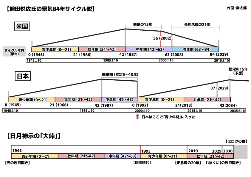 もし増田さんの言説が正しいのならば、日本が「神国」として「地の岩戸」を開く2029年までの間、意図的に経済低迷期を先に経験して、他の先進諸国が一斉に「衰退期」を迎えるタイミングで「働き盛り」の中年期に入ることになります。