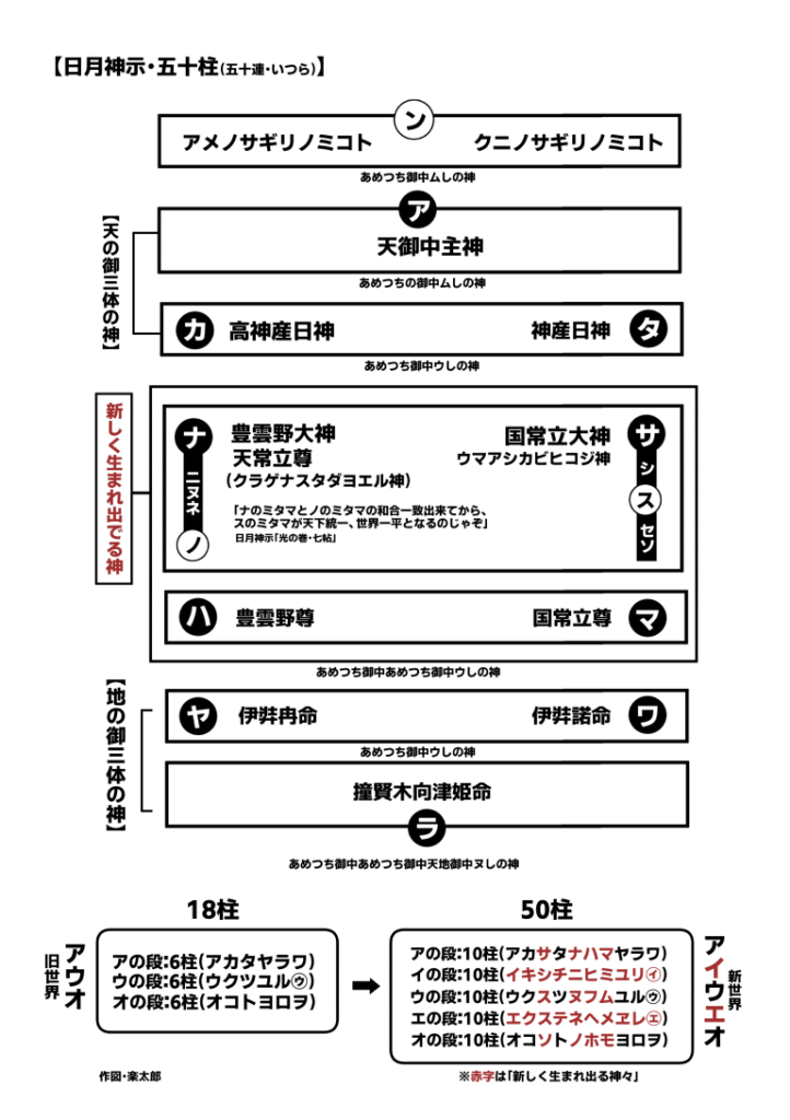 「五柱の元つ太神(アイウエオ)」が揃うと、「三十二柱」が新たに生まれ「五十柱」になるということは、それまでは「十八柱」だったことになります。