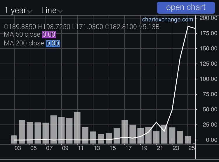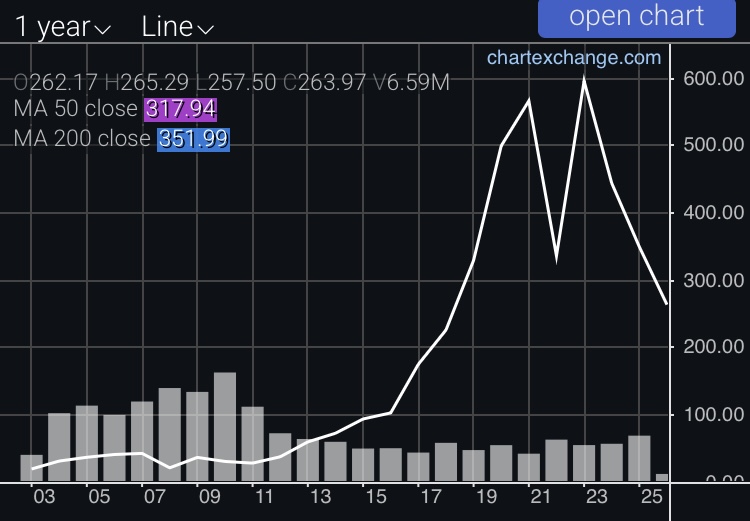 現在の株価は「182.87ドル」ですが2025年辺りの最高値から下落基調に入っています。