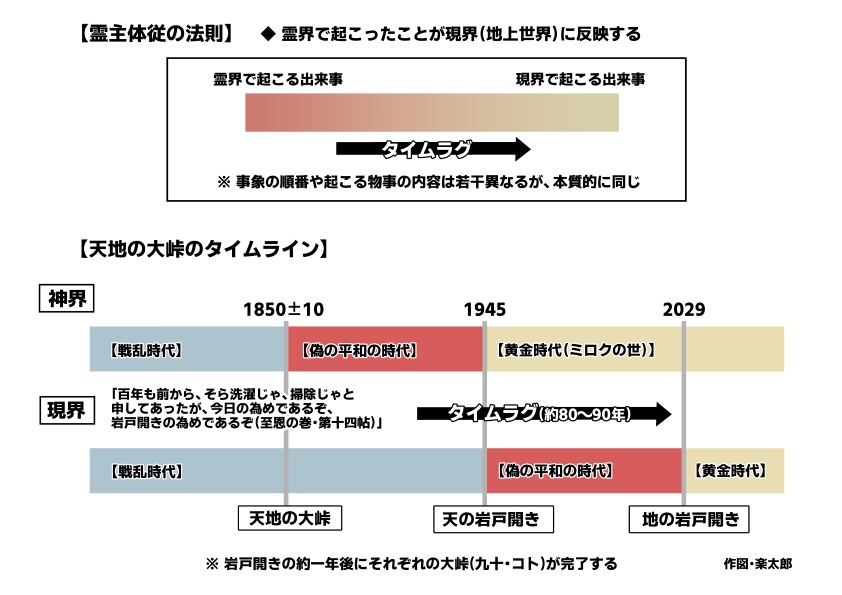 地上で起こることが予め霊の世界で起こり、実際に神界と現界の間で約80年のタイムラグがあることを鑑みると、神界の大峠にも時系列が存在するはずです。